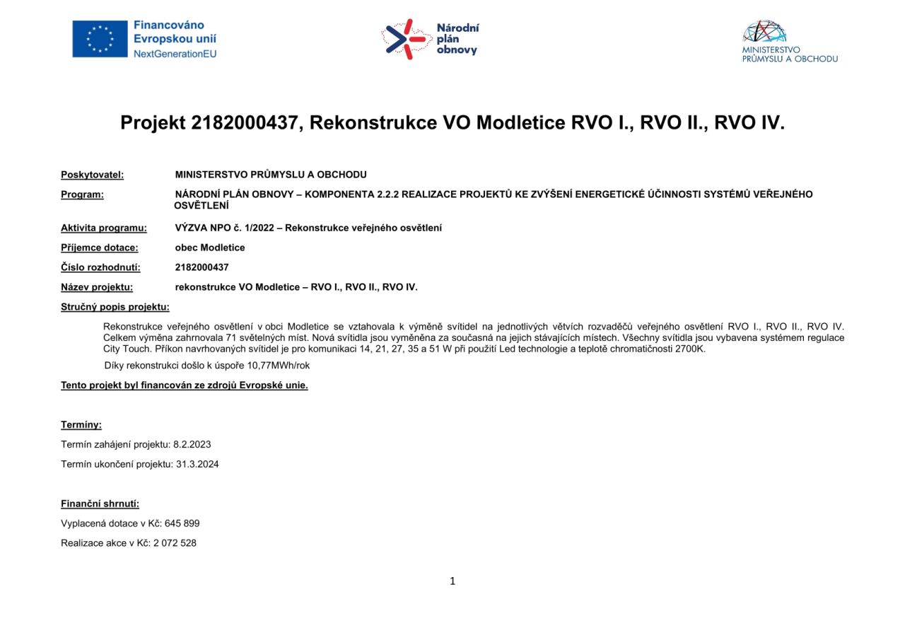 Rekonstrukce veřejného osvětlení v obci Modletice se vztahovala k výměně svítidel na jednotlivých větvích rozvaděčů veřejného osvětlení. Celkem výměna zahrnovala 71 světelných míst. Nová svítidla jsou vyměněna za současná na jejich stávajících místech. Všechny svítidla jsou vybavena systémem regulace City Touch. Příkon navrhovaných svítidel je pro komunikaci 14, 21, 35 a 51 W při použití LED technologie a teplotě chromatičnosti 2700K.
